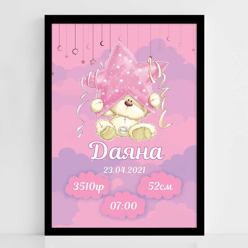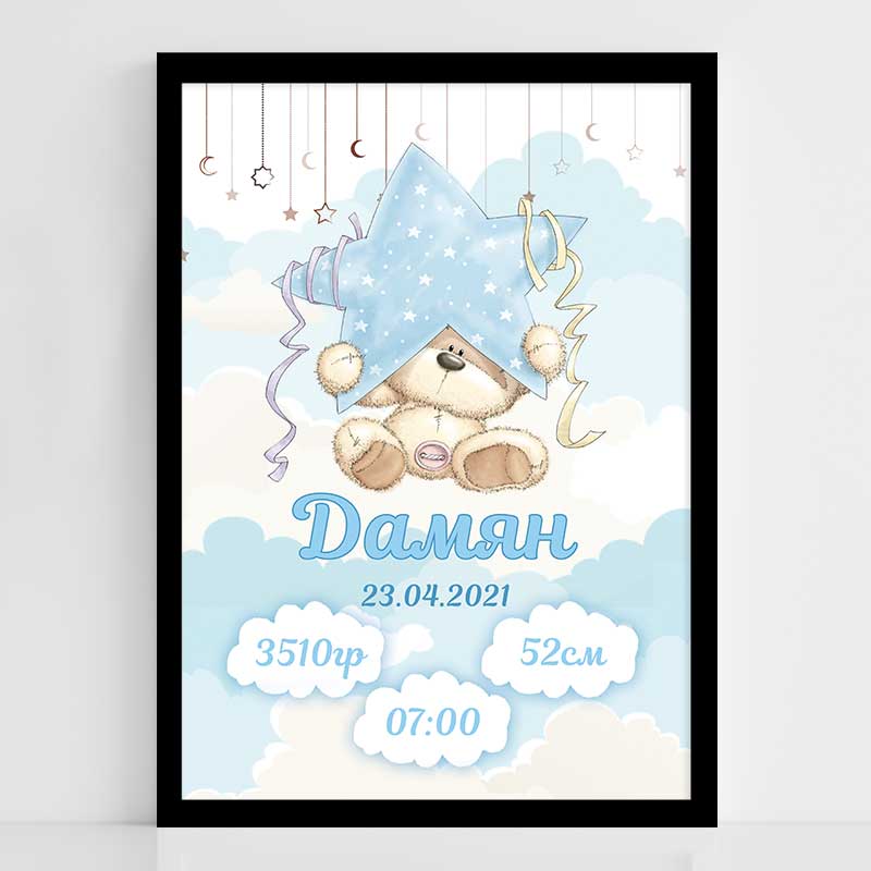 Персонална бебешка рамка-визитка с данните от родилното или за първи рожден ден. Това е прекрасен персонализиран подарък за нови родители, при декориране на детската стая или игралната стая за бебе. Приветствайте всяко мъниче, като запазите неговите данни в красив дизайн, с висококачествен печат и рамка. Цвета на рамките, които предлагаме е само черен. Може да бъдете сигурни, че се отнасяме с професионализъм и отговорно отношение към изработката на всички подаръци. Високо качество и доброто обслужване са най – малкото, което ще получите. Изработката и доставката са в срок от 5 (пет) работни дни. Доставката се извършва от куриерска фирма.
